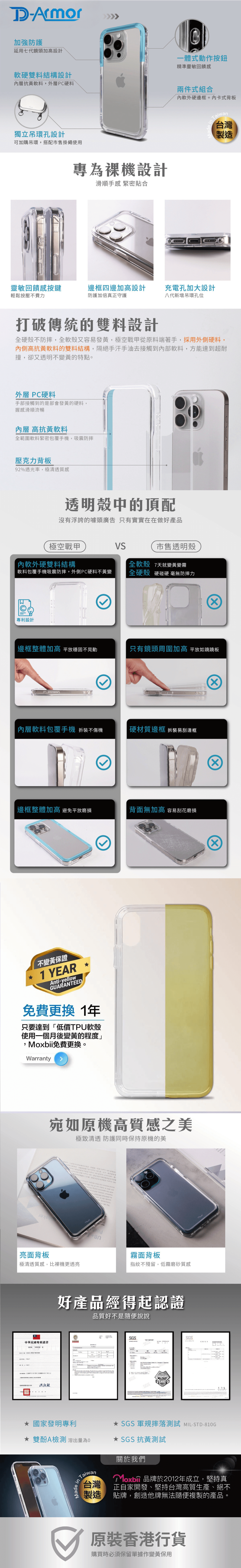 Moxbii D Armor 真正台灣製造、自家生產。獨家透明雙層外硬內軟,超強軍級防撞,卻不變黃,【並非一般硬底軟邊】。
