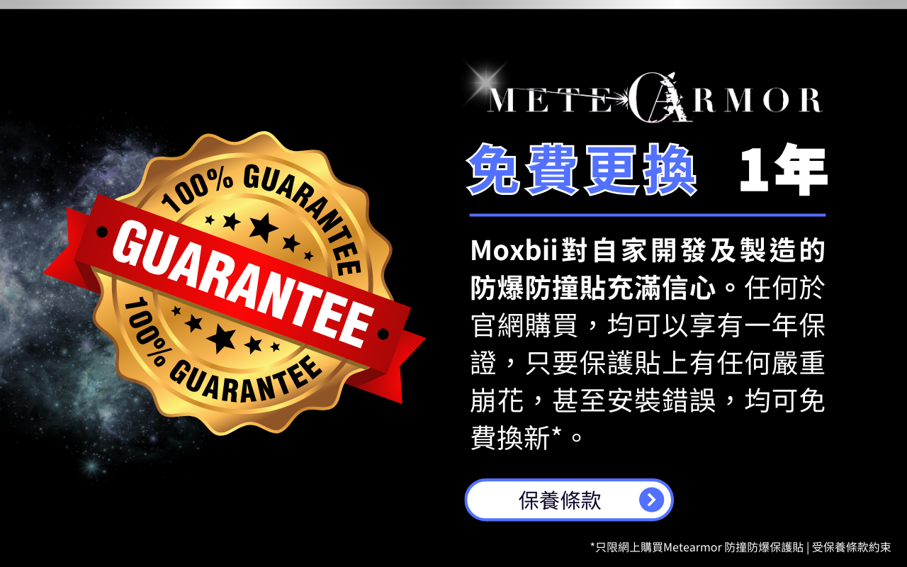 <比玻璃貼更耐用、防撞防爆> Moxbii 以專利技術將玻璃纖維加到防爆貼並達9H 堅固硬度,使防爆貼都可以做到玻璃貼的順滑手感,內層的矽膠軟性物料吸震防撞,高效保護屏幕!台灣開發及製造並使用日本進口物料。一年保證。