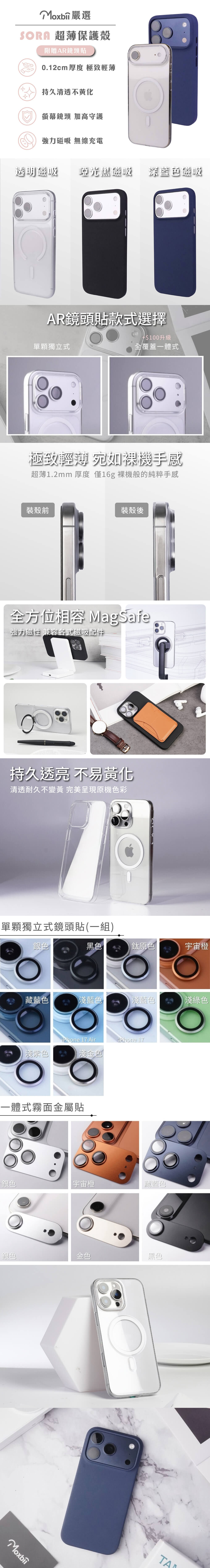 超薄殼連 AR 鏡頭貼,僅 0.12cm 超輕薄,不易變黃。螢幕鏡頭加高保護,強力磁吸,支援無線充電。